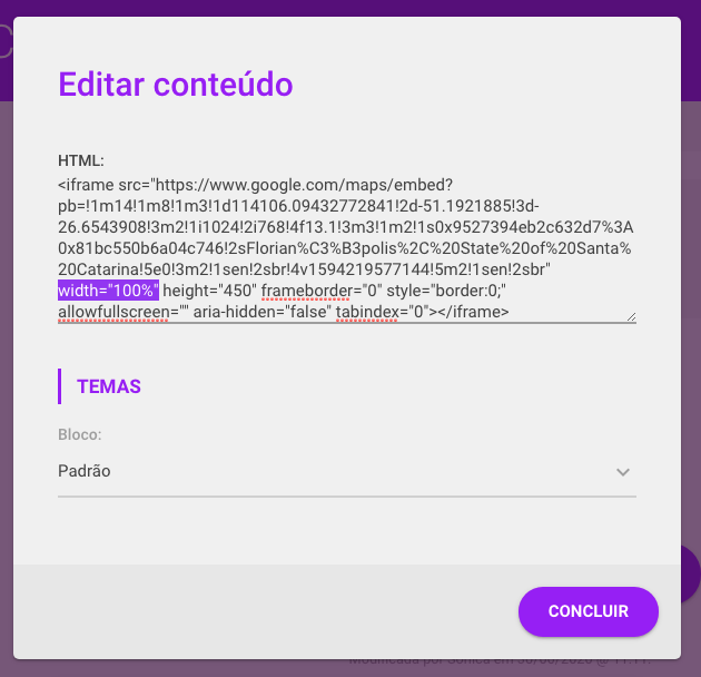 5. Cole o código HTML e substitua no código colado o parâmetro width para 100% conforme o exemplo abaixo: